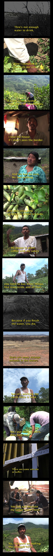 Juan Lopez, a Tzotzil Mayan man with ejidal land in Chenalhó, tells of his going to the U.S. in order to survive, the struggle to stay alive crossing the desert in August, the difficulty of finding work, the heavy debts to coyotes, and his return with just enough saved to plant coffee and seed his land and start a new life on his land. His wife and children speak of their desperation while he was gone.